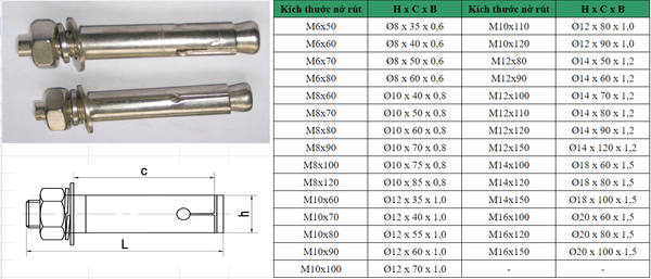 + Đường kính thông thường: M6, M8, M10, M12, M16, M18, M20, M22