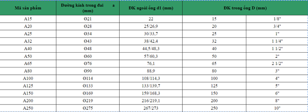 Đai treo ống và cùm treo ống có nhiều kích thước khác nhau để phù hợp với từng loại ống và yêu cầu kỹ thuật của công trình. Các kích thước phổ biến của đai treo ống thường dao động từ 15 mm đến 250 mm, cho phép linh hoạt trong việc sử dụng cho các hệ thống đường ống.